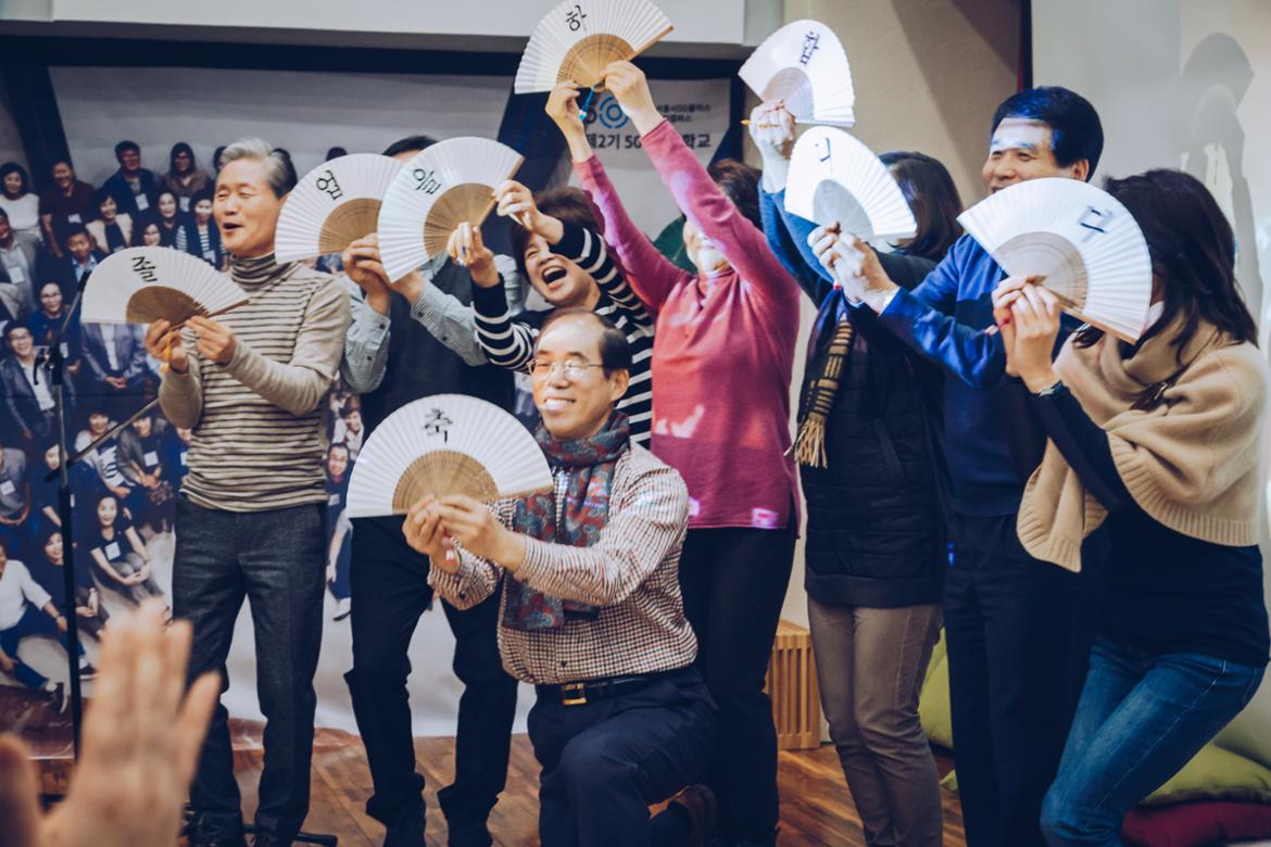 한창 춤판이 벌어졌는데 1기생들이 하나둘씩 무대로 올라가 부채를 펼쳤다. 뭔가를 만들어내고 있었다. 아하~ ‘졸.업.을.축.하.합.니.다.’ 아이디어가 돋보이는 퍼포먼스였다.