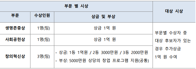 - 각 부문별 수상자에게 1 억원의 상금 수여 (대상은 1 억 추가)