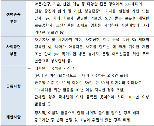 50+세대의 삶의 질 향상을 위한 사회공헌 활동 및 업적, 아이디어 등을 발굴·시상함으로써 건강한 사회적 가치를 창출하고, 혁신과 헌신을 통해 50+세대에 기여하고자 함