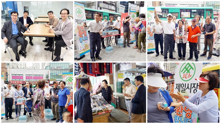 ‘전통방’이 만들어진 지 2달 만에 제일시장 앞에서 ‘우리동네 전통시장 이름이 뭐지?’라는 타이틀로 거리 홍보를 진행하였습니다. 시장을 여러 번 방문해 보고, 상인회 및 상인 개별 면담을 통해 지나가는 사람들의 눈길을 끌 만한 홍보가 절대적으로 부족하다는 결론을 얻었기 때문입니다. 사람들이 많이 다니는 평일 3~5시를 중심으로 시장 입구 양쪽에서 광고용 전단지를 나눠주며 전통시장을 잘 이용해 주십사 생수를 나눠주었습니다. 더운 날씨에 생수를 나눠주는 이벤트는 큰 호응을 얻었습니다. ‘전통방’ 회원들 모두 생전 처음 해보는 일이라 처음에는 좀 어색했지만, 점차 호응이 있자 나중에는 신이 나서 열심히 활동하였습니다. 어느 때보다 뿌듯한 순간이었습니다.