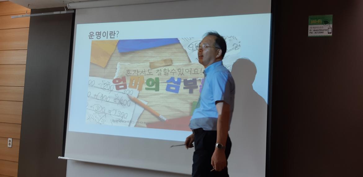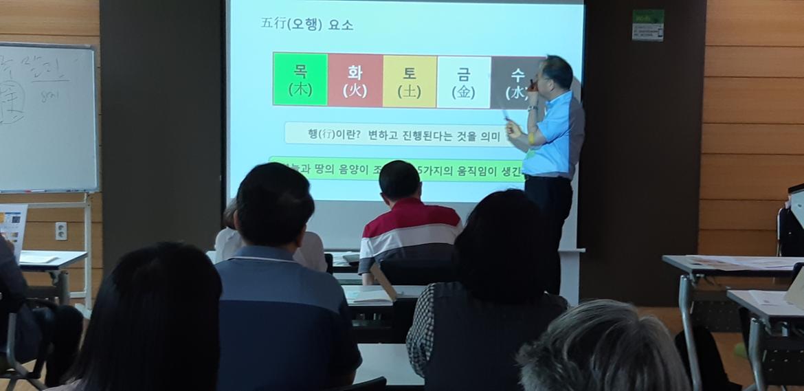 오늘(7월 10일) 오전 11시부터 센터 2층 배움터에서 ‘사주팔자로 나를 알아보기’란 제목으로 강좌가 시작되었다. 교실에서는 김창태 수년간 커뮤니티를 진행한 내공으로 다져진 강사의 구수한 목소리로 재미있게 수업이 진행되고 있었다. ‘사주팔자로 나를 알아보기’강좌는 총 8회차 강의로 오늘의 주제는 음양과 오행론 - 음양과 오행의 의미와 원리, 오행의 상생과 상극이다.