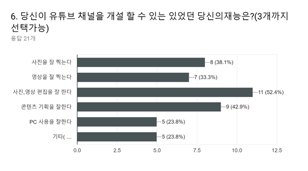 특히 수강생들이 유튜브 채널을 개설하는데 많이 도움이 된 부분은 사진, 영상 제작과 편집 능력이라는 것을 보여주고 있다.