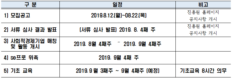 . ‘SE프로지원사업참여자로 선발되면 활동 시작전에 기초교육을 수하여야 하며(교육기관: 한국사회적기업진흥원)