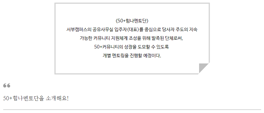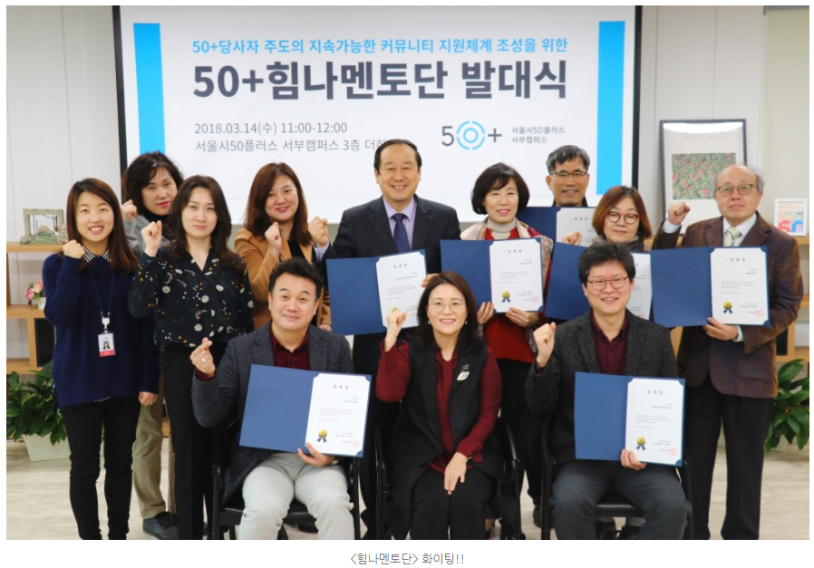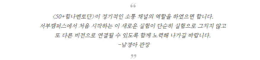 이제 막 시작한 서부캠퍼스의 또 다른 실험에 무한한 응원을 보내며, <힘나멘토단>을 통해 50+에게 다양한 활동 기회를 제공하고,
