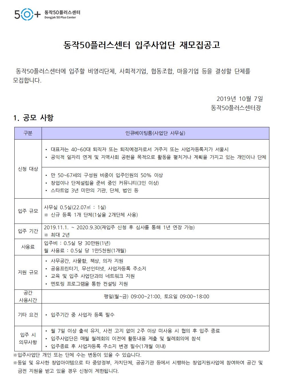 2021년 동작50플러스센터 입주사업단(코워킹스페이스) 모집공고
