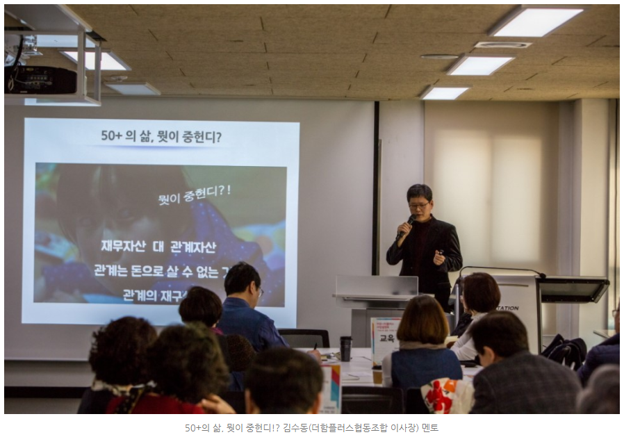 첫 마이크를 잡은 김수동(더함플러스협동조합 이사장)은 50 이후의 삶에서 중요한 관계 자산을 풍요롭게 하는 커뮤니티 활동(작당)에 대해 멘토로서
