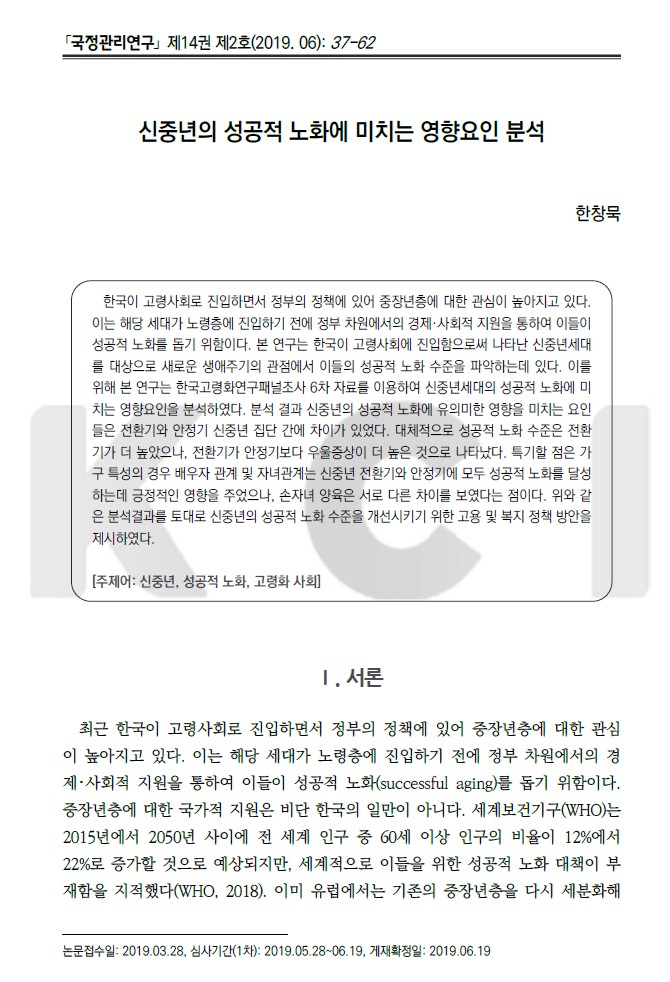 분석 결과를 토대로 신중년의 성공적 노화 수준을 개선시키기 위한 고용 및 복지 정책 방안을 제시함.