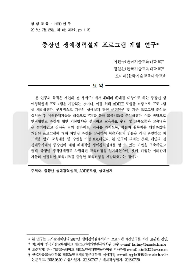 • 이 연구의 목적은 개인의 전 생애주기에서 40대와 60대를 대상으로 하는 중장년 생애경력설계 프로그램을 개발하는 것. 이를 위해 ADDIE 모형을 바탕으로 프로그램을 개발함.