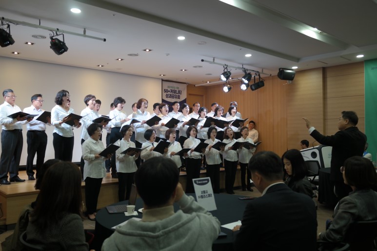 50+커뮤니티 성과 공유 회의 시작은 50+세대의 다양한 활동 모습을 담은 영상으로 시작되어 50+하모니와의 아름다운 우리 악기 연주와 풍류 사랑의 시원한 난타 공연으로 시작되었습니다. 그리고 커뮤니티 참가자들의 마음에 같은 세대라는 공감이 되도록 만든 공연은 바로 합창단의 공연이었습니다.