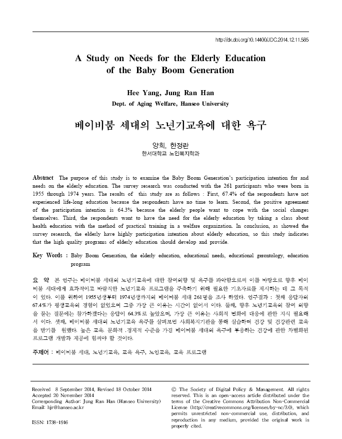• 베이비붐 세대의 노년기 교육 참여 의향과 욕구를 파악해 향후 효과적이고 바람직한 노년기 교육 프로그램을 구축하기 위한 기초자료를 제시함.