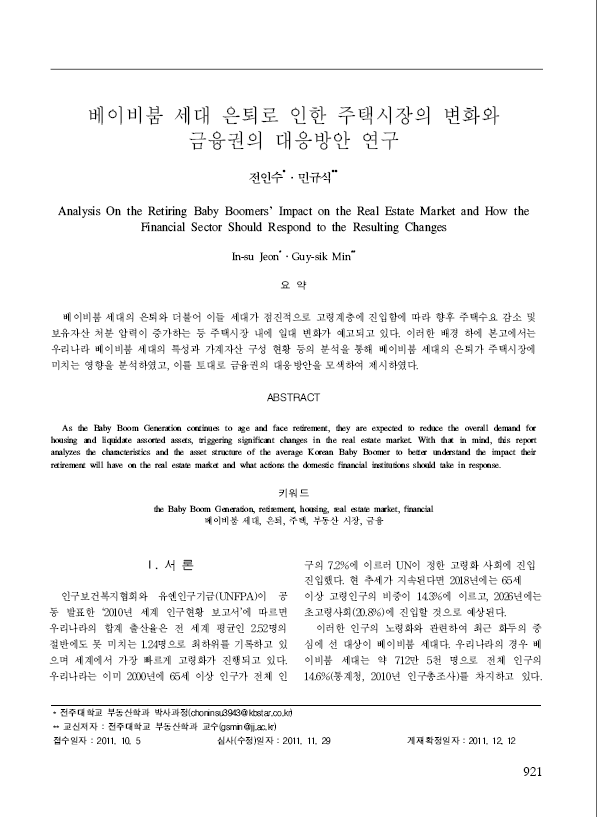 베이비붐 세대 은퇴로 인한 주택시장의 변화와 금융권의 대응방안 연구