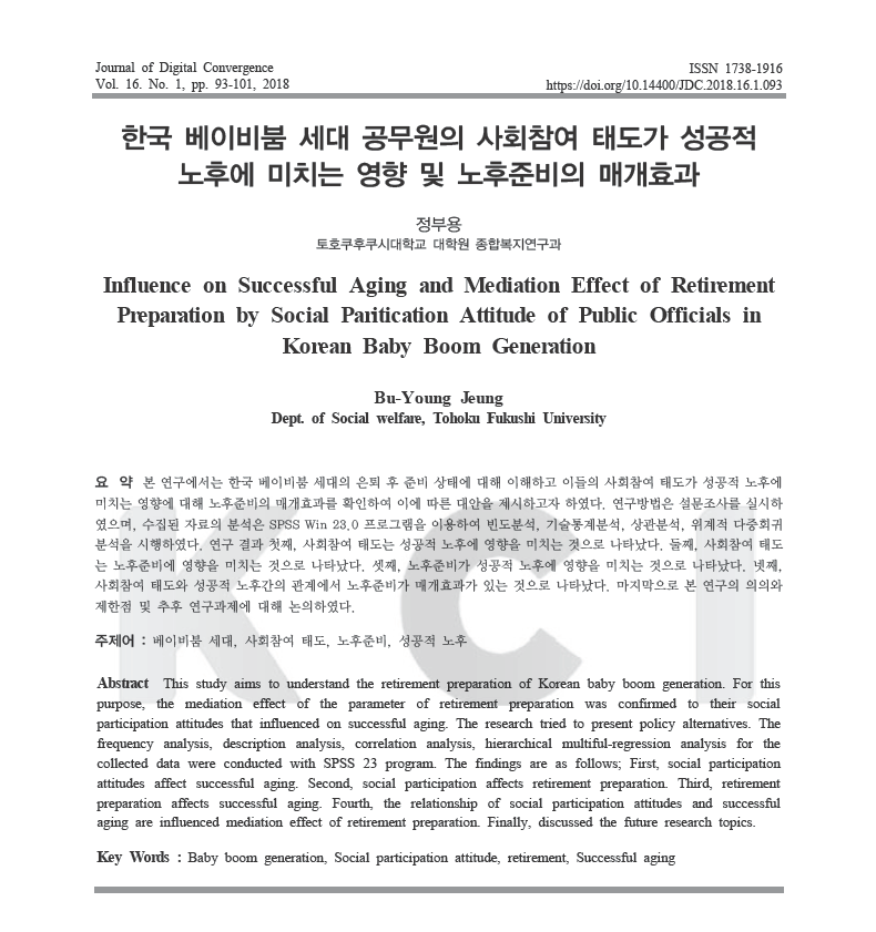 • 강원도 지역 50세 이상 베이비붐 세대 공무원을 대상으로 이들의 은퇴 후 준비 상태를 파악하고, 이들의 사회참여 태도가 성공적인 노후에 미치는 영향과 관련해 노후준비의 매개효과를 확인한 연구.