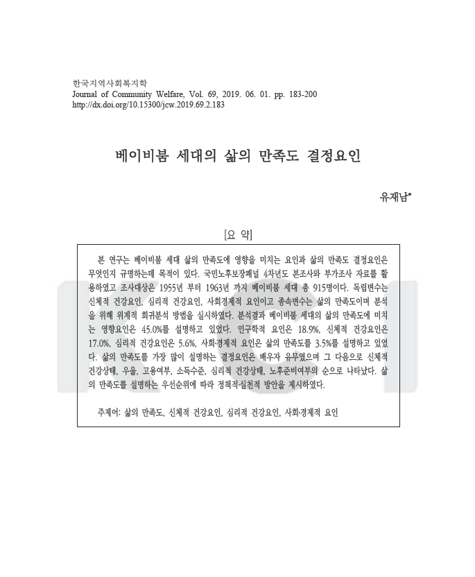 • 베이비붐 세대의 삶의 만족도에 영향을 미치는 요인과 삶의 만족도 결정요인은 무엇인지 규명하기 위한 연구.