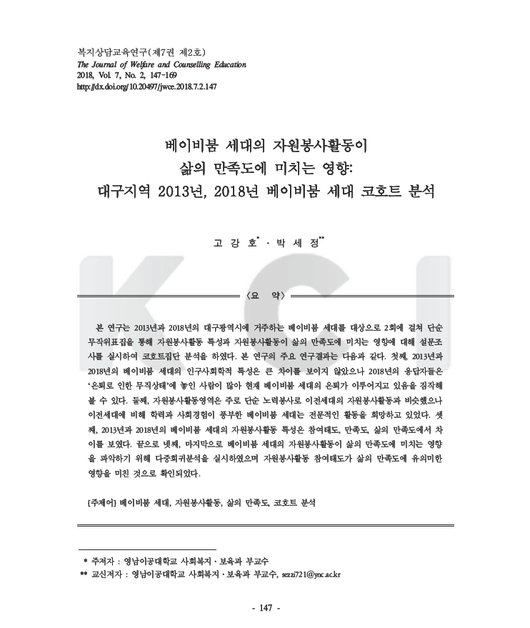 2013년과 2018년, 대구광역시에 거주하는 베이비붐 세대를 대상으로 2회에 걸쳐 자원봉사 활동 특성과 자원봉사 활동이 삶의 만족도에 미치는 영향에 대해 설문조사해 코호트 분석을 한 결과물.