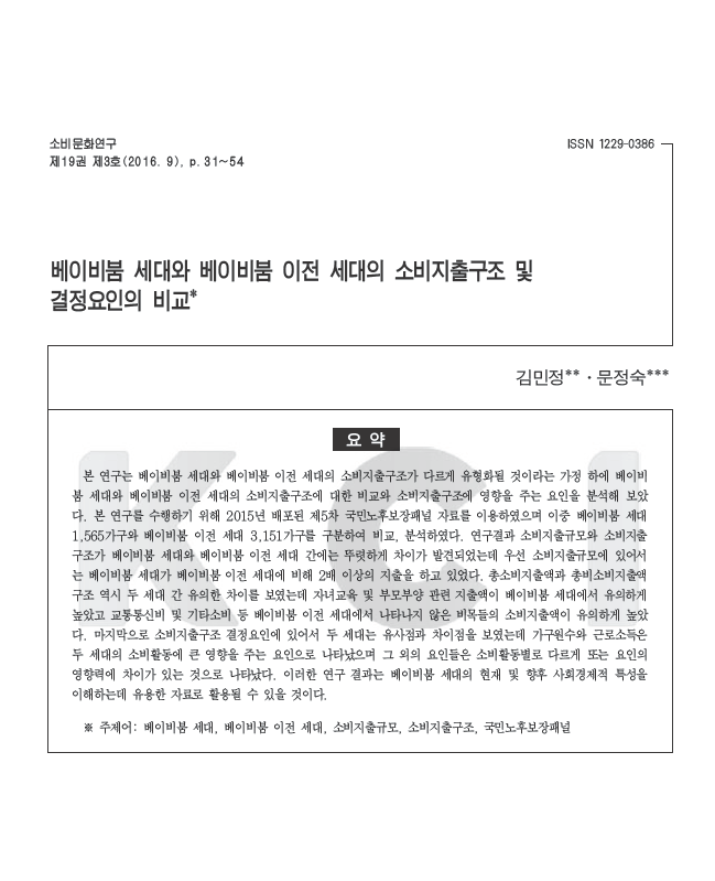 베이비붐 세대와 베이비붐 이전 세대의 소비지출구조가 다르게 유형화될 것이라는 가정 아래 베이비붐 세대와 베이비붐 이전 세대의 소비지출 구조를 비교하고, 소비지출 구조에 영향을 주는 요인을 분석함.  2015년 배포된 제5차 국민노후보장패널 자료를 이용했고, 이중 베이비붐 세대 1,565가구와 베이비붐 이전 세대 3,151가구를 구분하여 비교, 분석함.