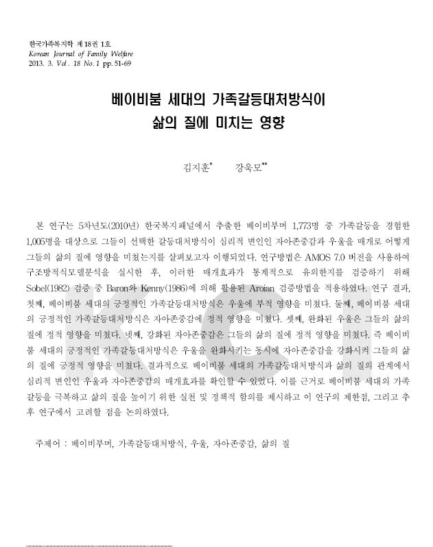 • 5차년도(2010년) 한국복지패널에서 추출한 베이비부머 1,773명 중 가족갈등을 경험한 1,005명을 대상으로 이들이 선택한 갈등대처방식이 심리적 변인인 자아존중감과 우울을 매개로 어떻게 삶의 질에 영향을 미쳤는지를 살펴보고자 한 연구.
