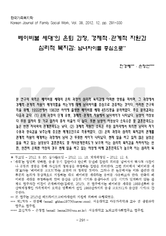 • 이 연구의 목적은 베이비붐 세대의 은퇴 과정이 심리적 복지감에 어떠한 영향을 미치며, 그 과정에서 경제적·관계적 자원이 매개역할을 하는가를 남녀의 차이에 주목하며 살펴보는 것임. 1955년에서 1963년 사이에 출생한 베이비붐 세대 4075명을 분석함.