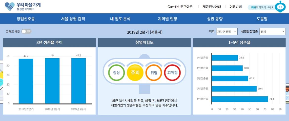 서울시는 '우리마을가게 상권분석 서비스'라는 사이트를, 소상공인진흥공단은 '상권정보'라는 사이트를 운영합니다. 두 사이트 모두 지역별, 업종별 상권 정보와 과밀 정도 현황을 파악할 수 있는 데이터를 제공합니다. 물론 실제 현장이 아닌 온라인상에서 모든 정보를 파악할 수는 없겠지만, 창업 계획을 수립하는 과정에서 기초적인 현황을 파악하는 데 도움을 주는 서비스라고 할 수 있습니다.