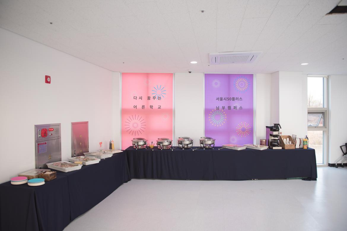 입구에는 50+인생학교 선배님들이 준비해놓은 멋진 케이터링이 기다리고 있었는데요.