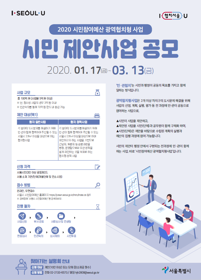서울민주주의위원회 서울협치담당관에서 추진중인 2020년 시민참여예산 광역협치형사업(2개 이상 자치구의 도시문제 해결을 위해 사업의 선정, 계획, 실행, 평가 등 전 과정에 민․관이 공동으로 참여하는 사업)을 아래와 같이 공모하오니, 많은 관심과 신청 바랍니다.