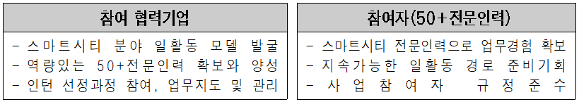 지능정보기술 등의 분야에 경험과 전문성이 있는 50+전문인력이 스마트시티 플랫폼 및 스마트 기술을 활용한 도시문제 해결 또는 서비스 개발 프로젝트에 풀타임 인턴십으로 참여하여, 향후 전문인력으로 일활동 연계 및 스마트시티 정책 확산의 브릿지로서 활동하도록 지원하는 사업