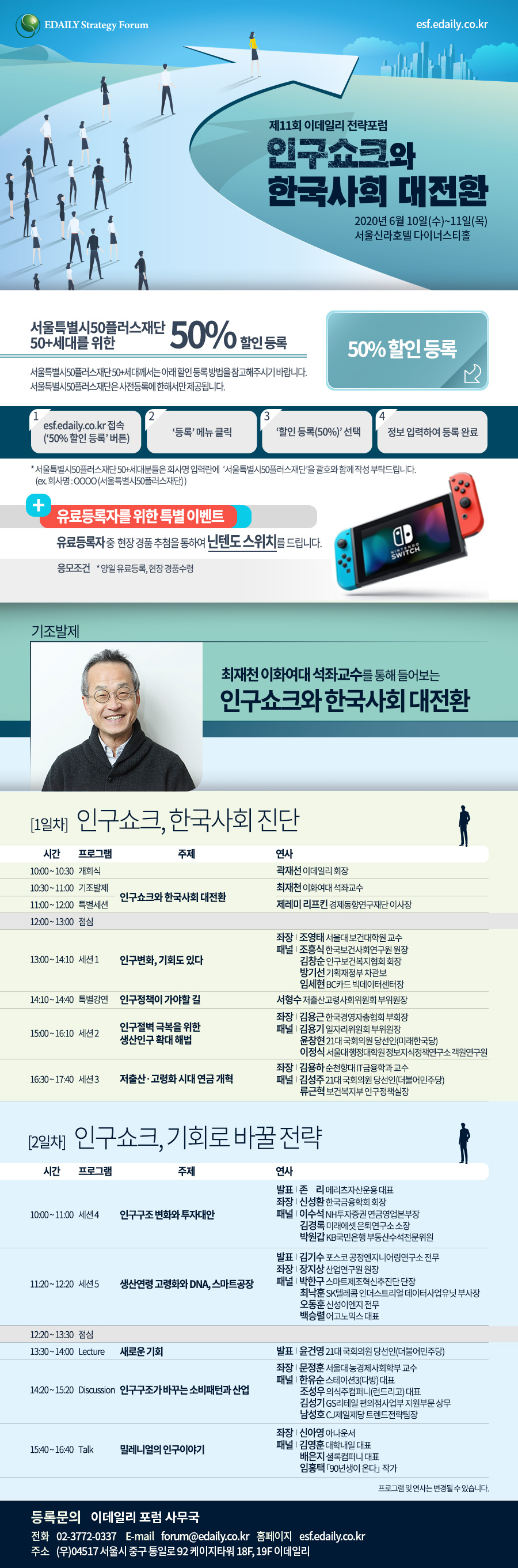이번 이데일리 전략포럼은 6월 10일과 11일 양일에 걸쳐 ’인구쇼크와 한국사회 대전환’이라는 주제로 진행됩니다. 국 · 내외 저명한 연사들의 강연과 함께, 한국사회의 인구변화에 따른 현 상황을 정확히 진단하고(1일차), 이로 야기될 미래의 대전환에 대비하고 기회요인을 모색하는