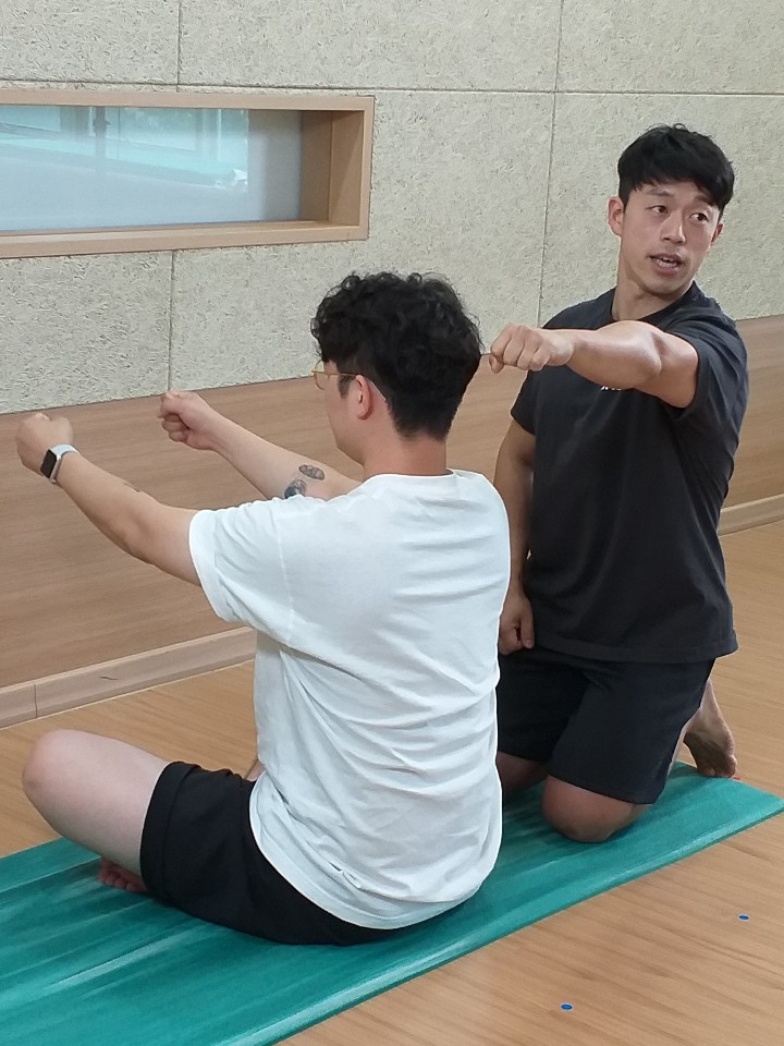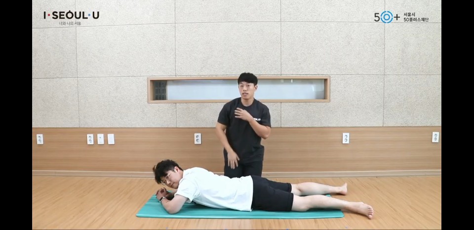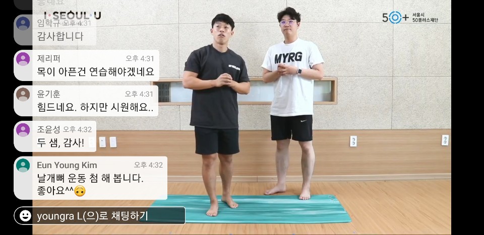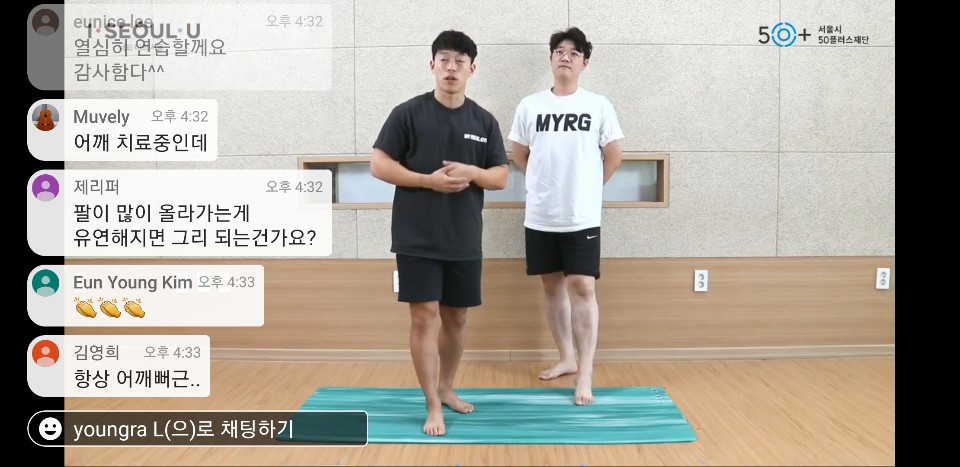 대면 강의에서는 주로 어렵고 복잡한 동작을 하지만 온라인 강의에서는 기본적인 몸풀기와 최소화된 동작으로 30분 동안 진행됩니다. 방구석 생활에 지친 50세대의 우울감을 날려버리고 기초체력과 생존 체력을 유지하기 위해 학습목표를 조금 낮췄다 하네요.