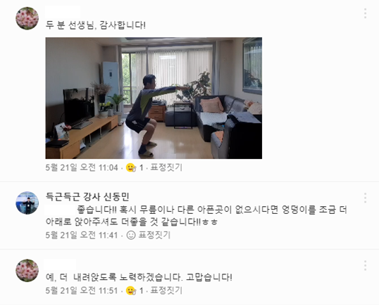 “온라인은 즉각 반응은 없어요. 그래서 진이 빠지기도 합니다. 그런데 댓글 창에 실시간으로 올라오는 글들을 보다 보면 제가 연예인이 된 기분이에요. ^^ 뭔가 온라인과 오프라인은 매력이 다른 것 같습니다.” (신동민강사.마이리얼짐 대표)