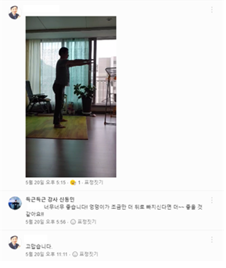 원래 서부캠퍼스의 득근득근은 수강 신청 오픈 10분 만에 마감되는 인기강좌죠. 하지만 20명 정원이라는 한계를 가지고 있었습니다. 유튜브에 홈트레이닝 영상들이 넘쳐나지만‘50+를 위한 근력운동’을 콘텐츠로 하는 곳은 보기 힘들죠. 그래서인지 온라인 수업은 비대면이라는 한계에도 불구하고 100명이 넘는 정원에 다시보기를 통해 400회 이상의 조회 수를 자랑하고 있습니다. 대면 강의만큼 정확한 자세에 대한 즉각적인 피드백이 있는 것은 아니지만 온라인이 가지는 한계를 극복하기 위해 노력하고 있습니다. 이 과정은 전(前) 수업에서 예습 동작 미리 맛보기 –> 실시간 라이브와 채팅창을 통한 소통. 숙제 –> 수업 후 네이버 밴드를 통해 수강생들이 올린 동영상 클립에 대한 평가와 교정이라는 과정을 거칩니다.