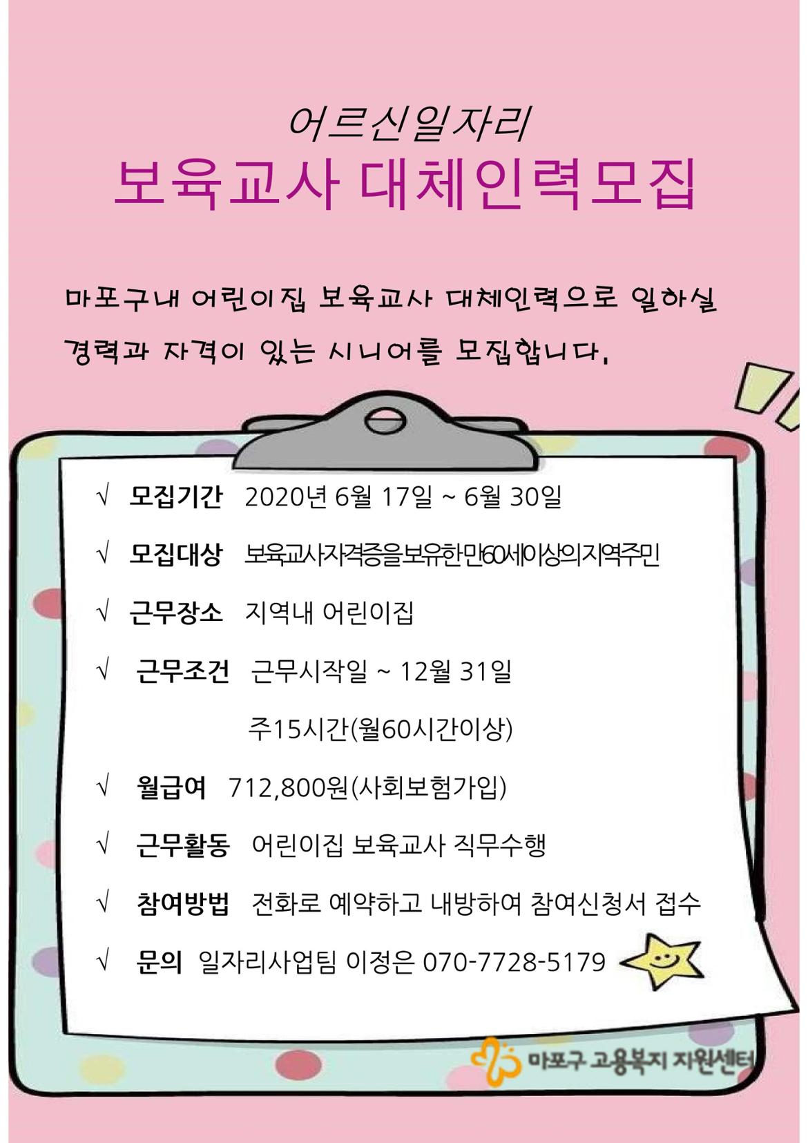 [마포구 고용복지지원센터] 보육교사 대체인력 모집(~6.30)
