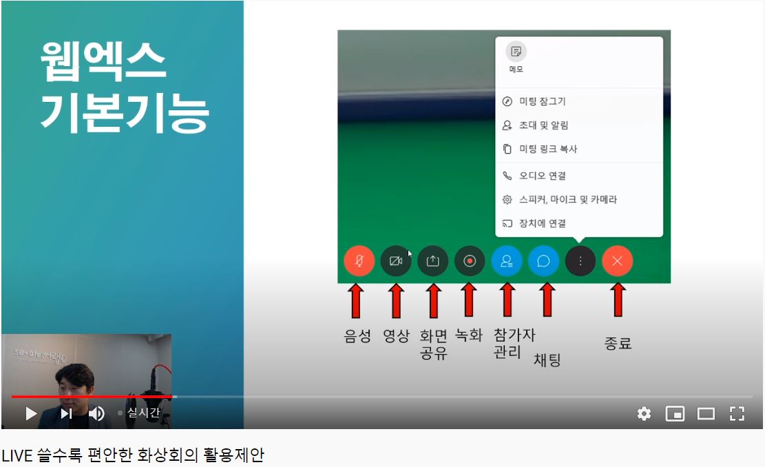 <웹엑스 활용시 제공되는 기본기능 설명화면>