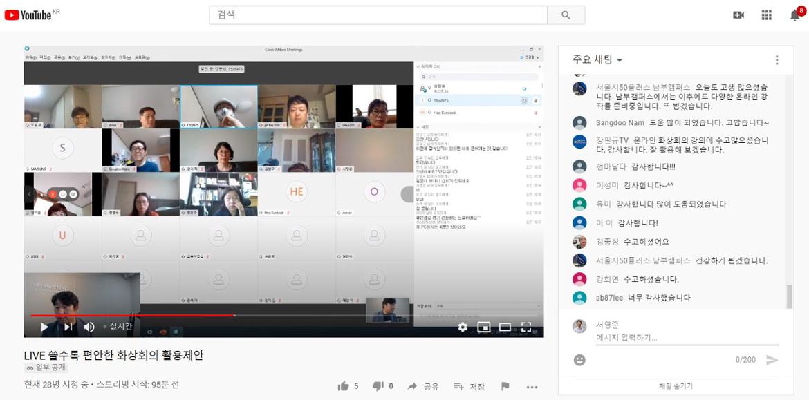 서울시50플러스재단 남부캠퍼스도 코로나19 확산으로 인해 오프라인 교육이 온라인으로 전환되고 있다. 남부캠퍼스는 온라인 교육툴로 ‘웹엑스(webex)’를 사용하기로 하고, 원활한 온라인 강좌 진행에 선제적으로 대응키 위해 지난 10일, 17일 두 차례에 걸쳐 유튜브를 통해 웹엑스 활용법에 대한 온라인 강의를 진행했다. ‘디지털 생활 제안’이라는 유튜브 채널 운영자인 유장휴강사가 ‘쓸수록 편안한 화상회의 활용 제안’이라는 타이틀로 17일 오전10시부터 2시간 동안 진행된 2강에서는 40여명이 참가해 언택트 시대에 공부하기 위한 도구인 ‘웹엑스’를 배웠다. 온라인 강의를 듣는 수강생 입장에서 이날 진행된 웹엑스 활용법을 소개한다.