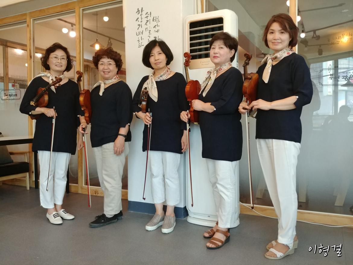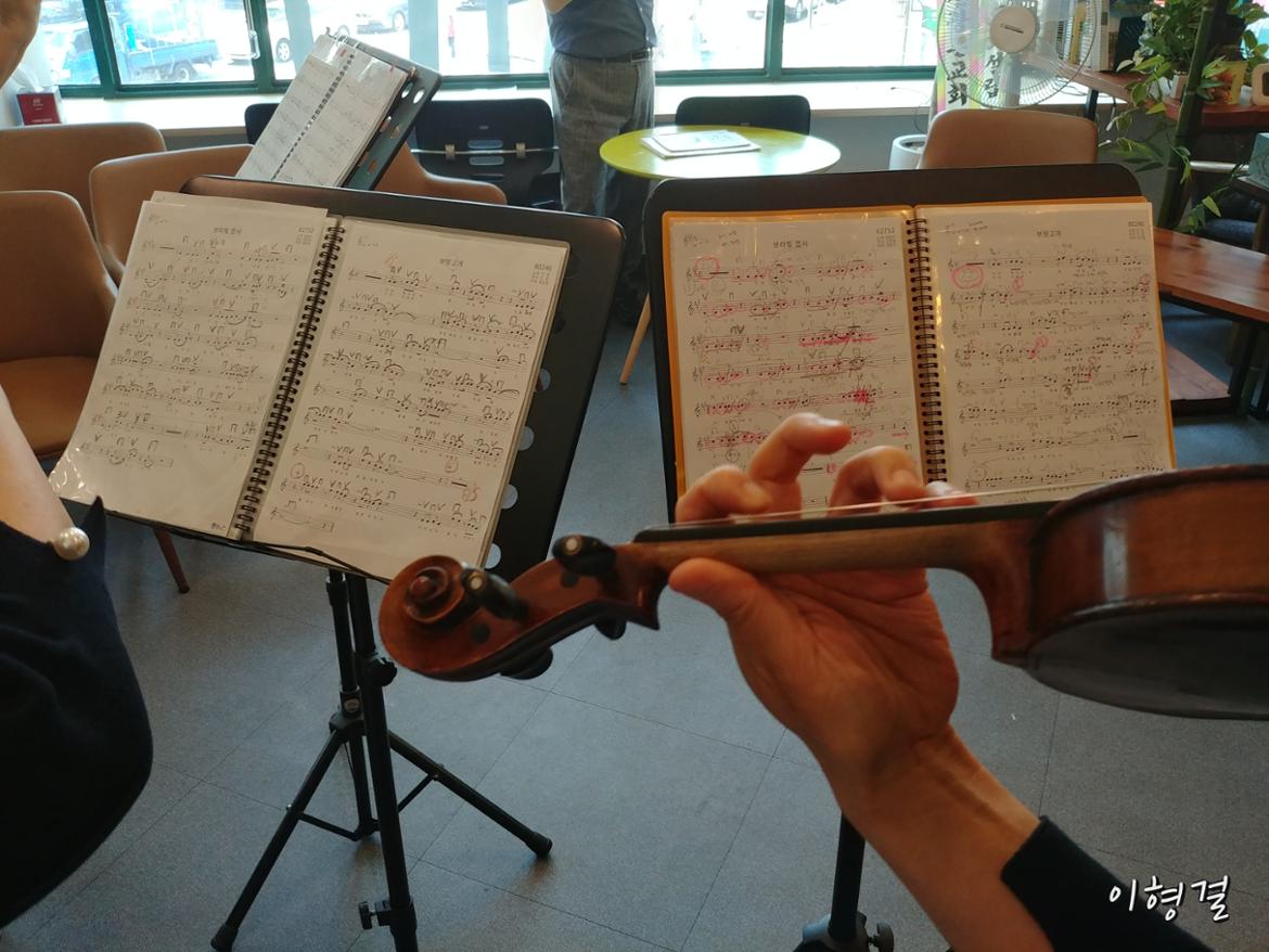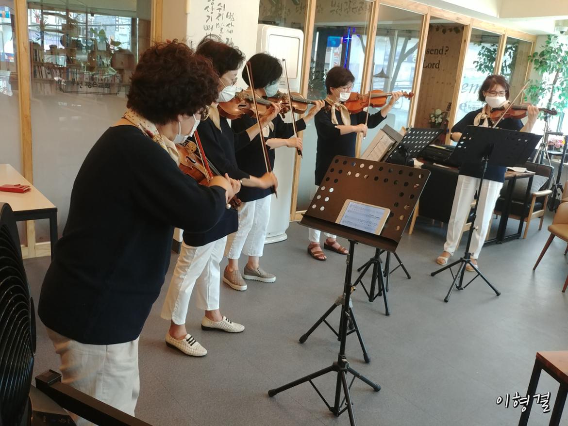 검정 셔츠에 하얀 바지 그리고 단아한 꽃나비 스카프, 까르르 웃는 모습에 소녀 감성이 남아있다. 50+ 여성들로 구성된 바이올린 동호회. 지난 19일(금) 오전, 경기도 부천시 경인로에 있는 카페 연습장에서 그들을 만났다. 인터뷰는 자못 진지했다. 어떤 이는 인터뷰 도중 기억이 나질 않을까, 감정을 놓칠까 걱정되어 답변 토씨까지 적어왔다. 코로나가 서울을 중심으로 수도권에서 확장 분위기이다. 만남이 매우 조심스럽다. 모두 마스크를 벗지 않고 눈으로 표정을 보면서 대화를 나눴다.