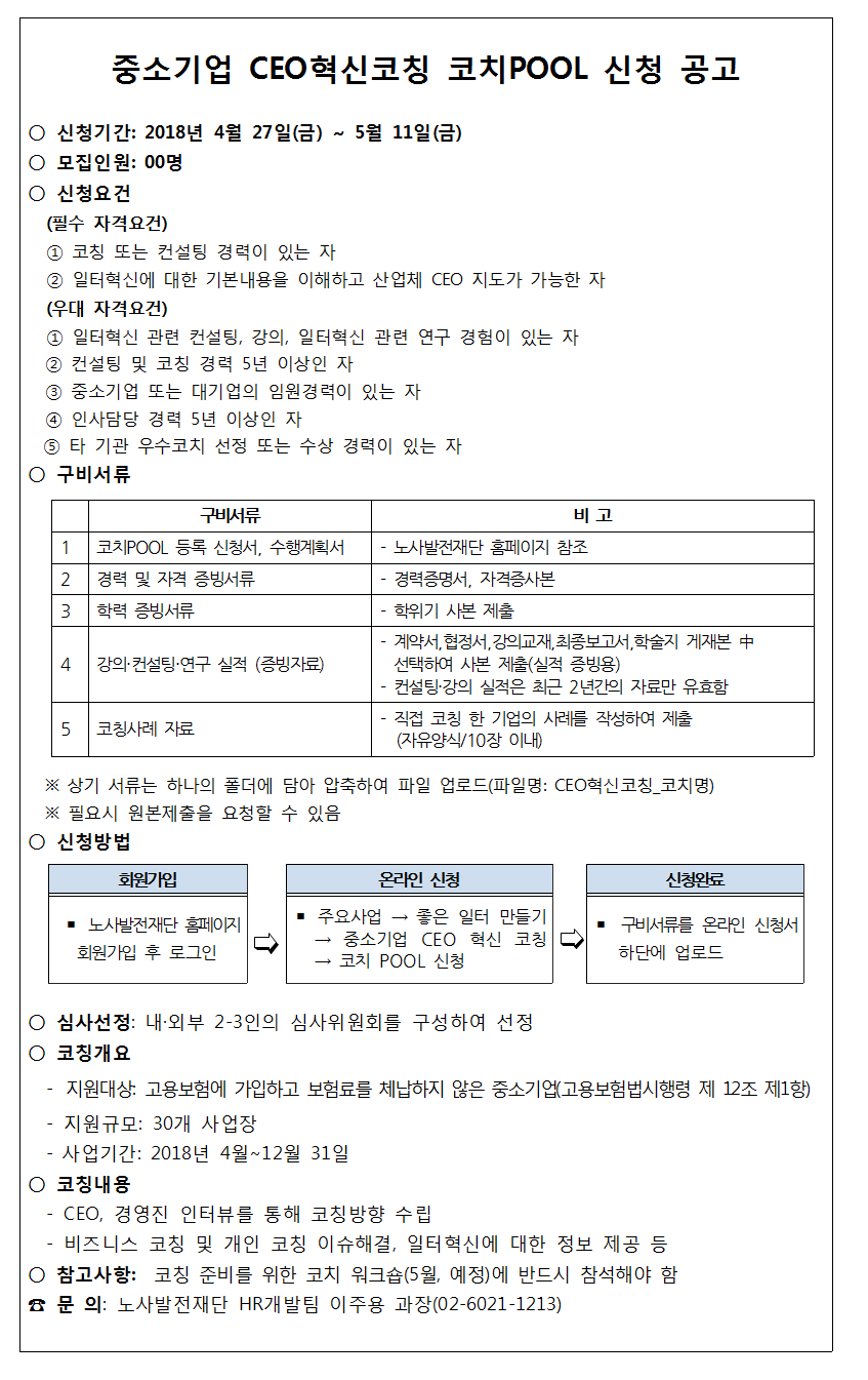 노사발전재단이 5월 11일까지 중소기업 CEO에게 일터 혁신 관련 코칭 및 컨설팅을 수행할 전문 인력을 모집합니다.