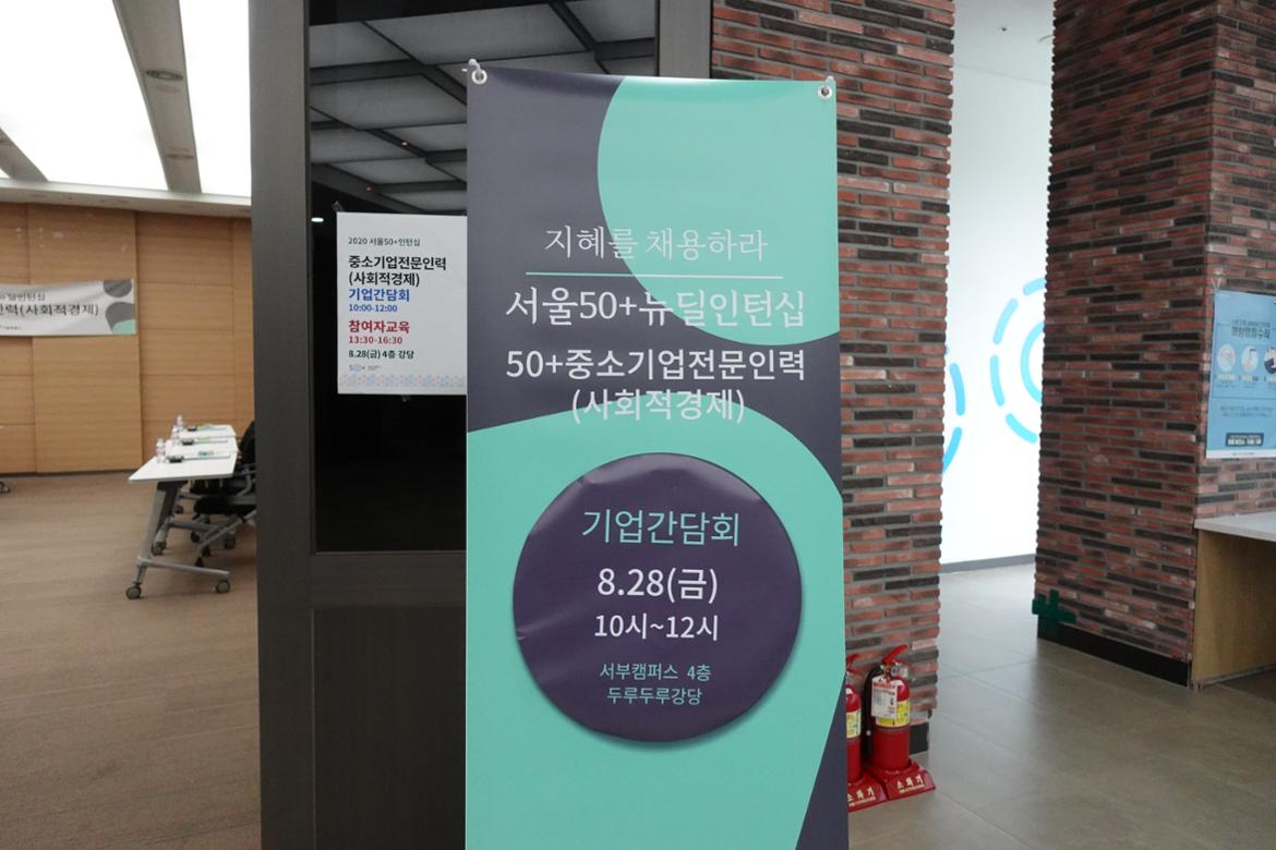 8월 28일(금) 서부캠퍼스 두루두루강당에서는 뉴딜인턴십에 참여하는 기업간담회 및 참여자교육이 열렸다. 이 사업은 사업기획관리, 인사노무, 홍보 마케팅 등 역량 있는 50+인턴과 사회적 경제기업을 연계하여 50+세대에겐 새로운 영역에서 경력전환을 시도해 볼 수 있는 기회를 제공하고, 기업의 인재확보와 경쟁력 강화에 기여하고자 하는 사업이다.