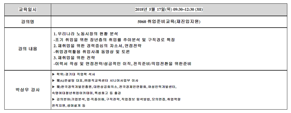 서울일자리센터가 5월 17일(목) 만50세~만62세 취업희망자를 대상으로 무료 취업 준비교육을 시행합니다.