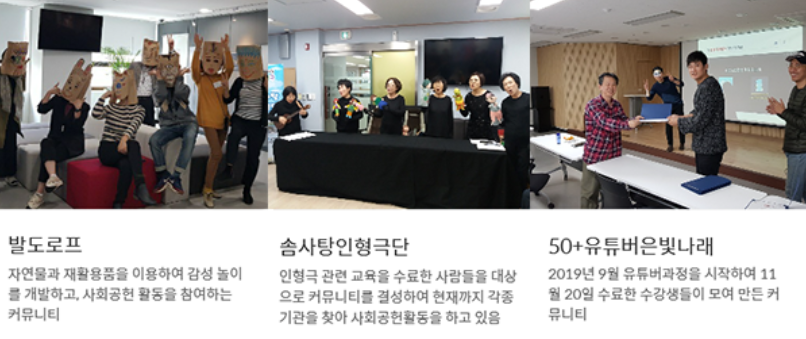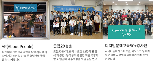 이날 미팅에서 가장 인상적인 것은 커뮤니티 지원단이었다. 특히 50+세대에게는 익숙하지 않은 정산 보고와 활동 보고 방법과 절차 등을 이들 지원단이 커뮤니티별로 상세하게 안내하고 보조하는 일을 한다. 커뮤니티지원단은 50+보람일자리를 통해 구성되어 월 57시간여 근무하고 소정의 활동비를 지급받는다.