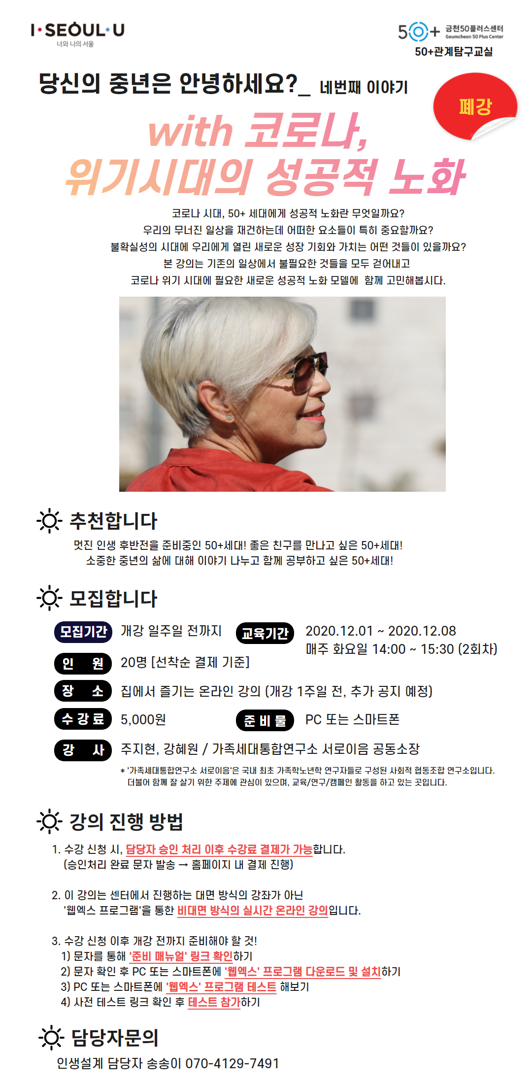 [인생설계/관계탐구교실] 당신의 중년은 안녕하십니까?_ 위기시대의 성공적 노화(폐강)