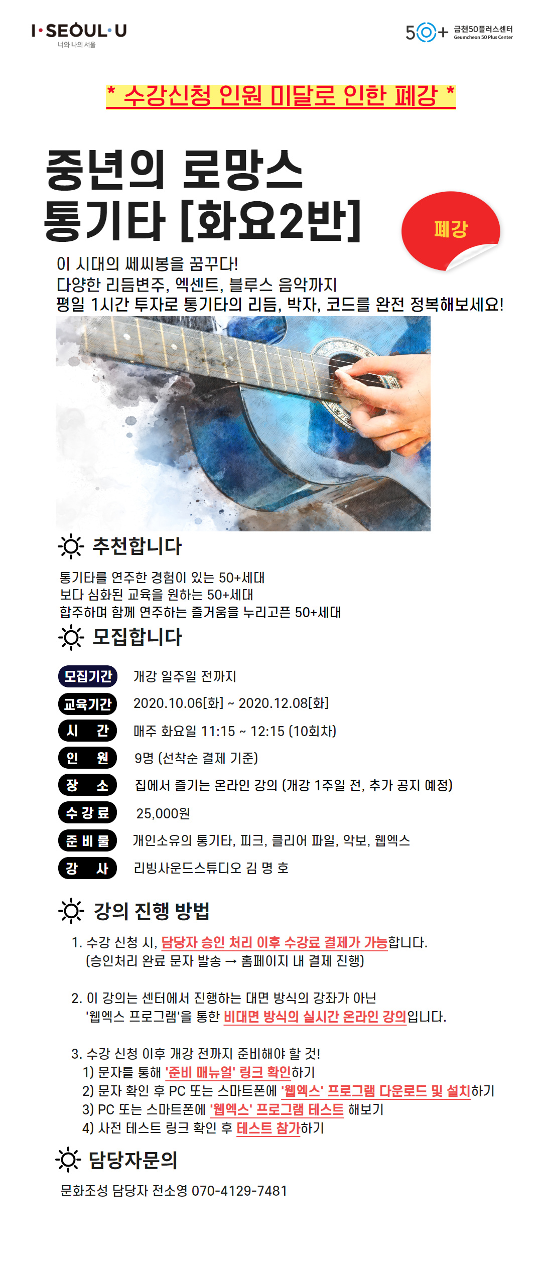 [문화조성]중년의 로망스 통기타 [평일2반] (폐강 예정)