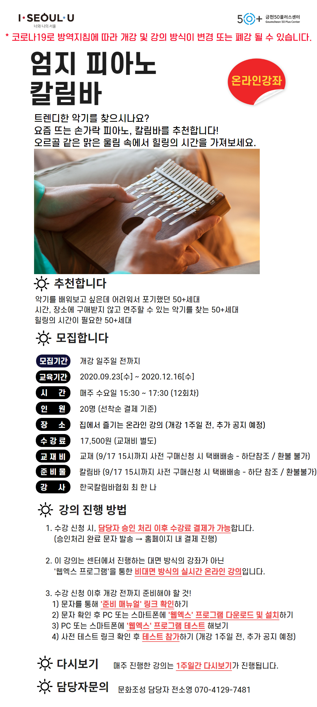 (1 회차) 2020.09.23(15:30 ~ 17:30) 4층 열림터 최한나 칼림바 소개와 자세 : 칼림바의 역사, 구조, 종류, 관리방법 칼림바 개별 준비(사전 구매신청 시, 현장구매 가능), 교재