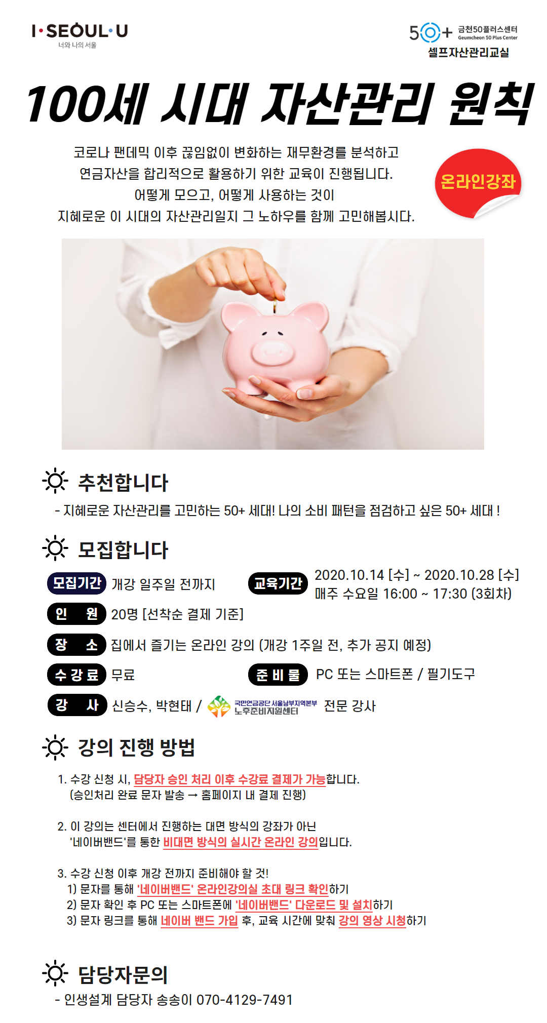 (1 회차) 2020.10.14(16:00 ~ 17:30) 온라인강의실 신승수 <변화하는 재무환경 이해 및 은퇴이후 원칙 알기>
