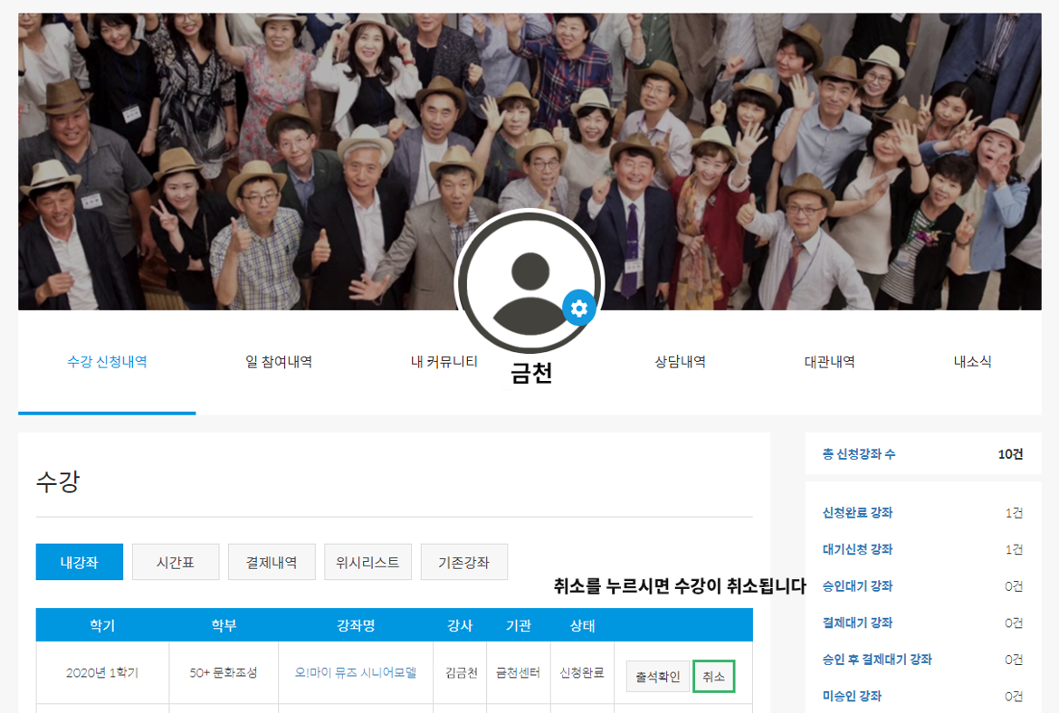[마이페이지] > [내강좌] > 취소를 원하는 강좌의 [취소] 버튼을 눌러주세요.