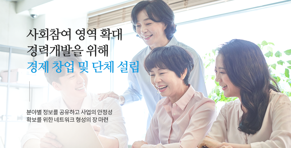 장년층의 사회참여 영역 확대 및 경력개발을 위해 사회적 경제 창업 및 단체 설립, 공모지원