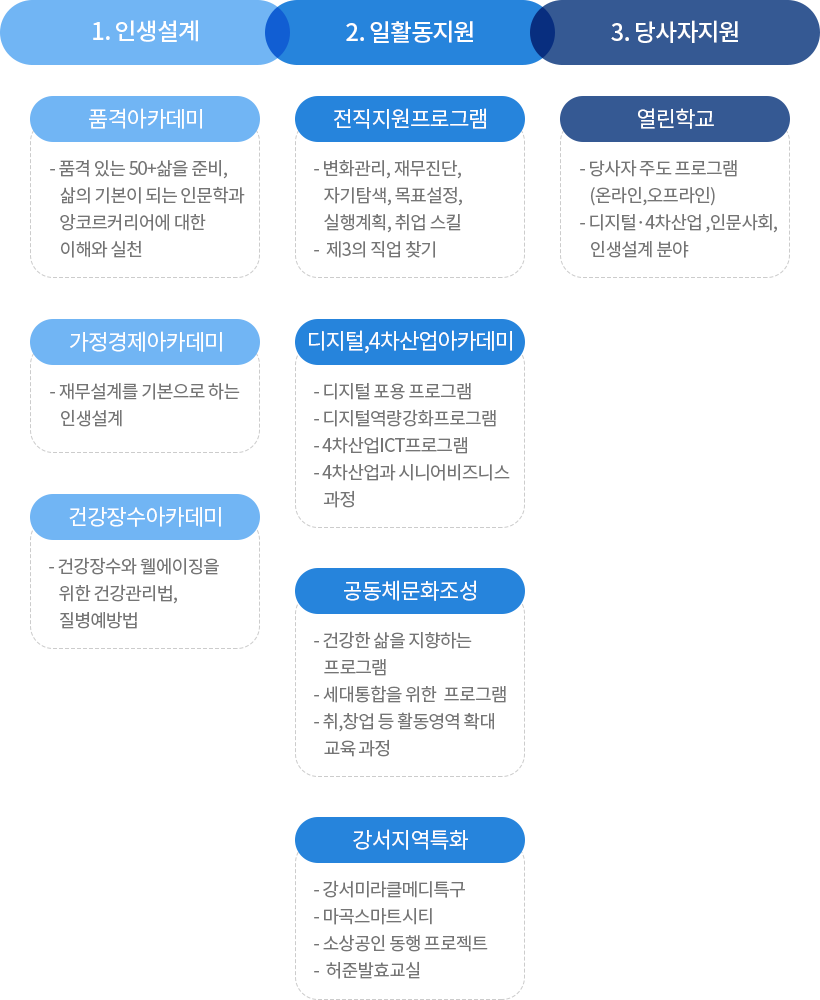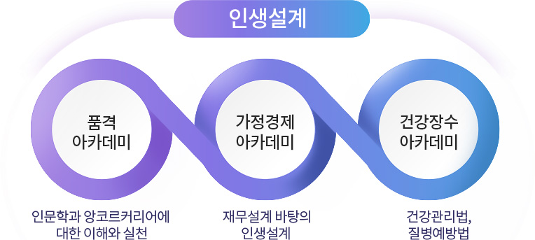 - 품격 있는 50+인생을 준비, 삶의 기본이 되는 인문학과 앙코르커리어(경력을 활용하여 사회공헌, 의미있는 일자리에 대한 개념)에 대한 이해와 실천