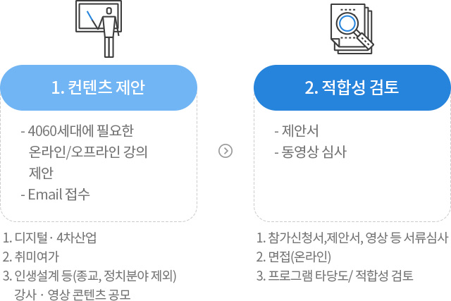 최신트렌드(코로나로 인한 사회변화, 4차 산업, 스마트도시) , 인문학 분야, 예술ㆍ문화분야, 심리, 취미ㆍ여가분야, 앙코르커리어 등 품격 있는 50+인생을 설계하기위한 통합 과정