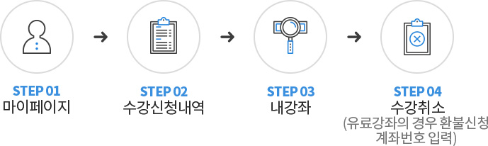 · 홈페이지 로그인 ⇒ 마이페이지 내 수강확인 및 취소 ⇒ 환불 처리(신청일로부터 2주 이내, 본인 명의 계좌 또는 카드 결제 취소로 환급)