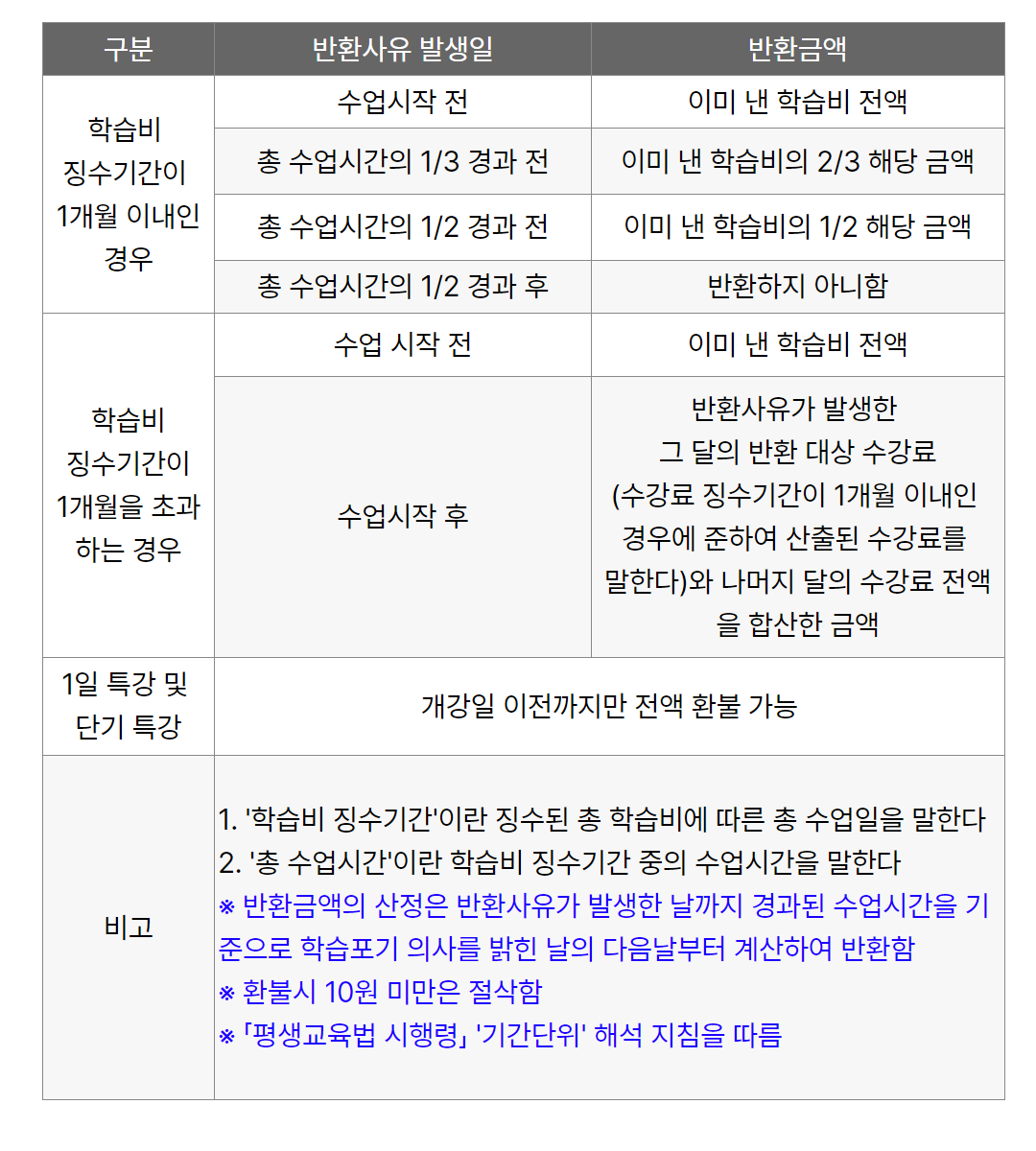 · 「평생교육법 시행령(제23조제2항) 학습비 반환기준」