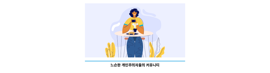 따로 또 같이, 느슨하게 연결된 커뮤니티를 만들 때 디지털 기술의 장점이 빛을 발한다. 한날한시에 모이지 않더라도 소통하고 협력하는 것이 가능한 디지털 커뮤니티는, 고독을 즐기는 개인주의자들이 느슨한 커뮤니티 활동을 하는 데 좋은 장이 되어준다. 관계를 끈끈하게 유지해야 한다는 압박감 없이, 자율적으로 커뮤니티 활동을 할 수 있다. 특히, 이러한 느슨한 디지털 커뮤니티는 생애주기에 맞는 역할을 해야 한다는 압박에서 벗어나 오롯이 자신에게 집중하고, 그로부터 삶의 전환을 모색하는 50+세대에게 자유로운 실험과 새로운 관계를 형성할 수 있는 공간이 되어줄 것이다.