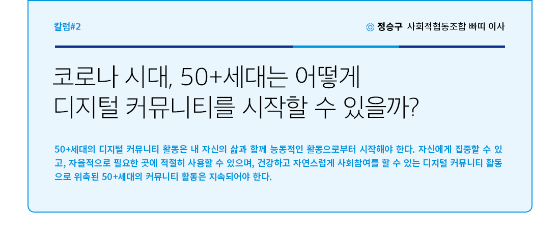 코로나 시대, 사회적 거리두기로 인해 위축된 50+커뮤니티 활동을 디지털 커뮤니티로 되살려보자는 제안을 했다. 그러나 모든 50+세대가 지금 당장 디지털 커뮤니티를 쉽게 만들 수 있는 건 아니다. 한 세대는 그 세대만의 보편적인 소통 기술과 문화가 있는데, 장년층에 접어들며 디지털 시대를 맞이한 50+세대는 디지털 도구의 자연스러운 학습과 활용 시간이 부족했다. 그런 면에서 ‘50+세대가 어떻게 디지털 커뮤니티를 시작하고 지속할 수 있을까?’라는 문제는 개인이 풀 문제라기보다는 공공의 문제로 보아야 할 것이다.