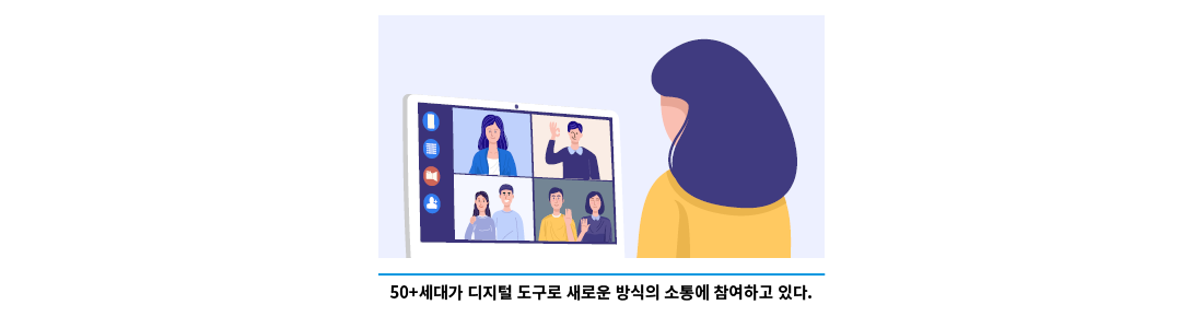 코로나가 장기화되고 있는 요즘, 50+세대가 디지털 도구로 새로운 방식의 소통에 참여하는 장면들이다. ‘그래도 어떻게 온라인으로 모이냐?’, ‘나는 스마트폰으로 복잡한 건 못한다'라며 아날로그 세상에 머물던 50+세대. 이들이 디지털 공간으로 향하는 걸음이 가속화되고 있는 느낌이다. 이런 흐름에 발맞춰 ’디지털 기술을 배워 잘 쓰며 나이 듦‘을 뜻하는 ‘디지털 에이징(digital aging)'이란 용어가 50+세대에게 더욱 중요한 개념이 되고 있다. 고령자의 삶의 질을 높이고 활동적인 삶을 영위하는 데 디지털 기술을 활용하며, 더 나은 삶을 누릴 수 있게 하는 방안과 전략을 뜻하는 ‘디지털 에이징’은 확실히 앞으로 중요한 사회적 화두가 될 것으로 보인다.